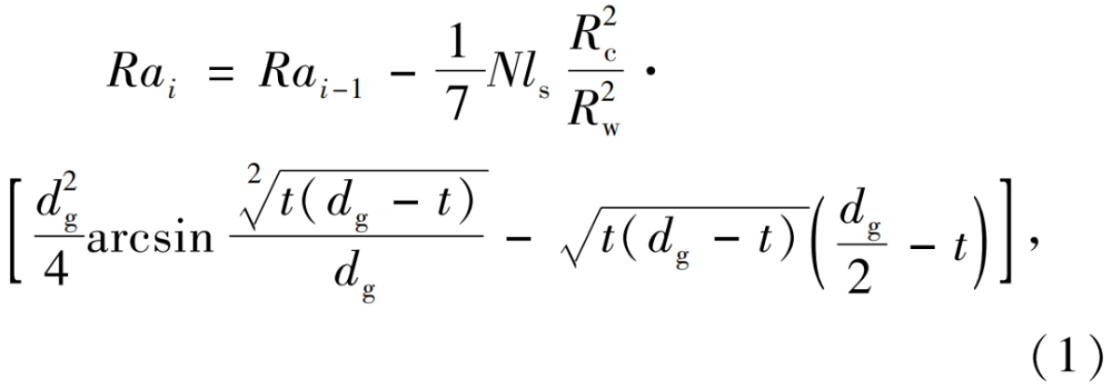 在磨料流加工中,假定工件內(nèi)表面輪廓均勻,初始表面粗糙度為Ra0,并且磨料在壓力作用下沿工件內(nèi)孔的軸線方向往復(fù)移動,劃痕方向上的峰谷粗糙度Rt0與算術(shù)平均表面粗糙度Ra比值恒定。假定Rai為第i次加工后獲得的內(nèi)孔表面粗糙度,其模型可由(1)式計算,即