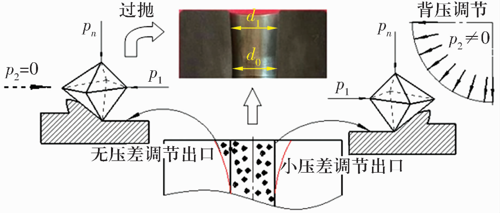在上述無背壓的“穿膛過”磨粒流加工條件下,將加工后的工件線切割開,可以明顯看出進(jìn)出口處的尺寸d1,大于中間區(qū)域的尺寸d0,并形成“喇叭口”。出現(xiàn)該結(jié)果的主要原因是由于黏彈性磨料在出口處的突然擠入與釋放時形成的擠壓壓力過大,從而在工件兩端出現(xiàn)嚴(yán)重的過拋現(xiàn)象,嚴(yán)重影響空心滾子的尺寸。為避免“喇叭口”的形成,應(yīng)該控制進(jìn)出口的壓差,使磨粒流在加工過程中實現(xiàn)均勻的擠壓運(yùn)動。因此,在擠壓過程中對磨粒流施加一個回程壓力,即背壓P2與“穿膛過”式(背壓P2為零)的情況相比,在擠壓過程中增加磨料流回程壓力,可以降低壓力在進(jìn)出口處的突變,實現(xiàn)進(jìn)出口處壓力的小壓差調(diào)節(jié),從而有效抑制“喇叭口”的形成,其原理如圖6所示。