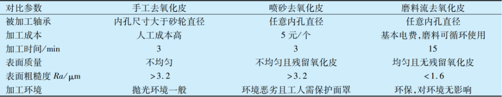 基于上述試驗結(jié)果,將磨料流去氧化皮方法與傳統(tǒng)手工和噴砂去氧化皮進(jìn)行對比,結(jié)果見表1,采用磨料流加工方法去除氧化皮的經(jīng)濟(jì)性和加工質(zhì)量均明顯優(yōu)于其他2種,且磨料流加工法更環(huán)保,但加工效率略低于其他2種。