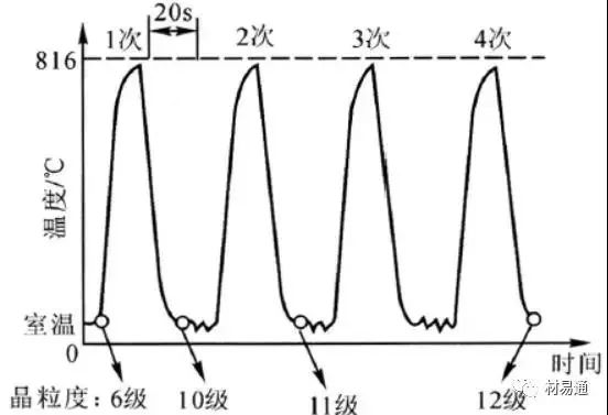 如圖1所示,首先將零件快速加熱到Ac3以上,經(jīng)短時間保溫后迅速冷卻,如此循環(huán)多次。由于每加熱一次,奧氏體晶體就被細化一次,所以經(jīng)過4次循環(huán)后,便使45鋼的晶粒度從6級細化到12級。
