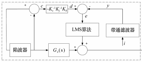 20世紀80年代,自適應(yīng)濾波算法獲得蓬勃發(fā)展,起初在噪聲消除方面應(yīng)用廣泛。LMS算法由于原理簡單,自適應(yīng)、抗干擾能力強,收斂性好等優(yōu)點獲得了廣泛應(yīng)用,并于20世紀90年代應(yīng)用于磁懸浮轉(zhuǎn)子不平衡振動控制領(lǐng)域。LMS算法實際上是一種離散自適應(yīng)陷波器,其原理如圖5所示。文獻[14]在2009年提出了基于LMS算法的實時變頻切換控制策略,降低了周期性不平衡激振力;隨后,為兼顧穩(wěn)定性和收斂速度,提出了變步長LMS算法并在不同定轉(zhuǎn)速試驗中取得了較好效果,而將H∞算法與自適應(yīng)步長LMS算法相結(jié)合實現(xiàn)實時最小慣性力補償,則提高了整個系統(tǒng)的魯棒穩(wěn)定性和抗干擾性能。另外,文獻[17]提出了一種基于LMS算法的自適應(yīng)前饋補償,抵消了功放低通特性的影響,其方法原理如圖6所示。